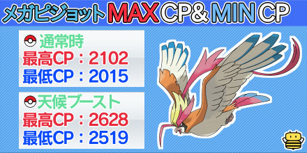 Sep 19, · メガピジョットは、メガシンカしてステータスが上昇したピジョットの姿。Sep 19, · 9月19日早朝からメガピジョットレイドが開始されます。 この記事ではメガピジョットレイド対策情報などについてまとめていきます。 メガピジョットのステータス メガピジョット ノーマル・ひこうタイプ、図鑑番号18 最大cp 攻撃種族値 防御種族値 hp種族値 3680 280 175 195 通常技 ゲージ技『ポケモンGO(Pokémon GO)』にて実施中の「メガレイドイベント」は、本日9月7日(月)で一旦終了となります。 メガピジョットを目指せ! メガ